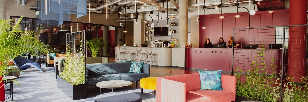 Arche Hotel Piła to nowoczesny obiekt hotelowy, położony w centrum miasta. Wnętrza hotelu zaprojektowane zostały w stylu industrialnym, z charakterystycznymi odkrytymi instalacjami na sufitach i betonowymi dekoracjami. Neutralne barwy ścian przełamane zostały kolorowymi akcentami, co doskonale podkreśla jego loftowy charakter.